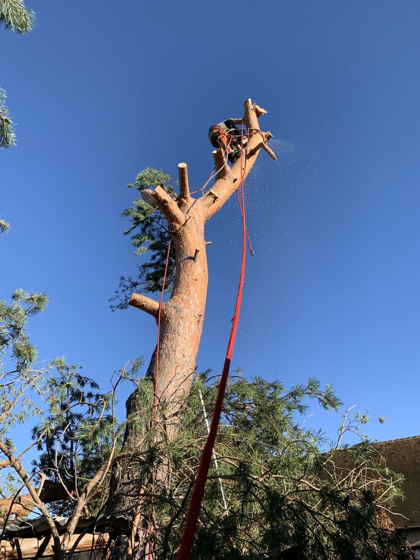 La sécurité est notre priorité. Nous installons un périmètre de sécurité au sol et utilisons un équipement de grimpe professionnel (harnais, cordes, nacelle si besoin) pour protéger vos infrastructures (toiture, clôture, lignes électriques) et nos intervenants.